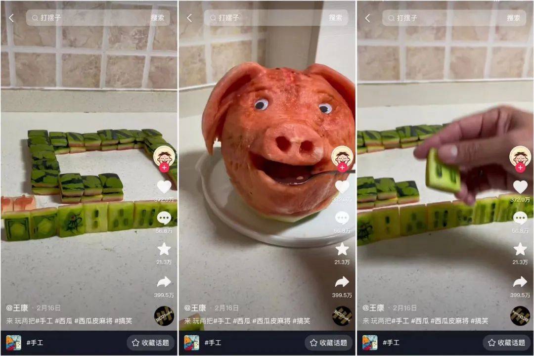 抖音#手工 话题下点赞量最高的一条视频只有短短6秒,展示了创作者@王康 用西瓜皮雕刻的一副麻将,以及旁边摆着的用西瓜瓤雕刻的猪头。更加有趣的是,视频末尾拍摄者还从猪嘴中盛了一勺西瓜汁喝。