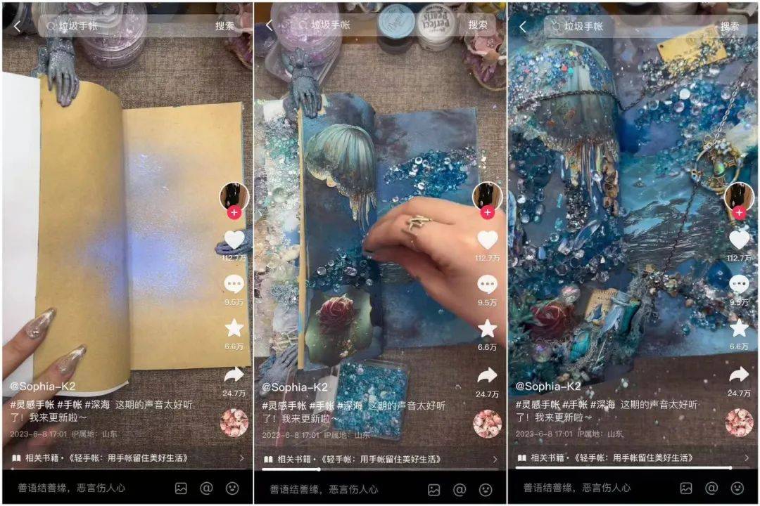 比如@Sophia-K2 ,是抖音上一位记录自己制作手账过程的博主。在她的手中,空白的纸张可以变成神秘的海底、静谧的森林、奇幻的魔法世界……