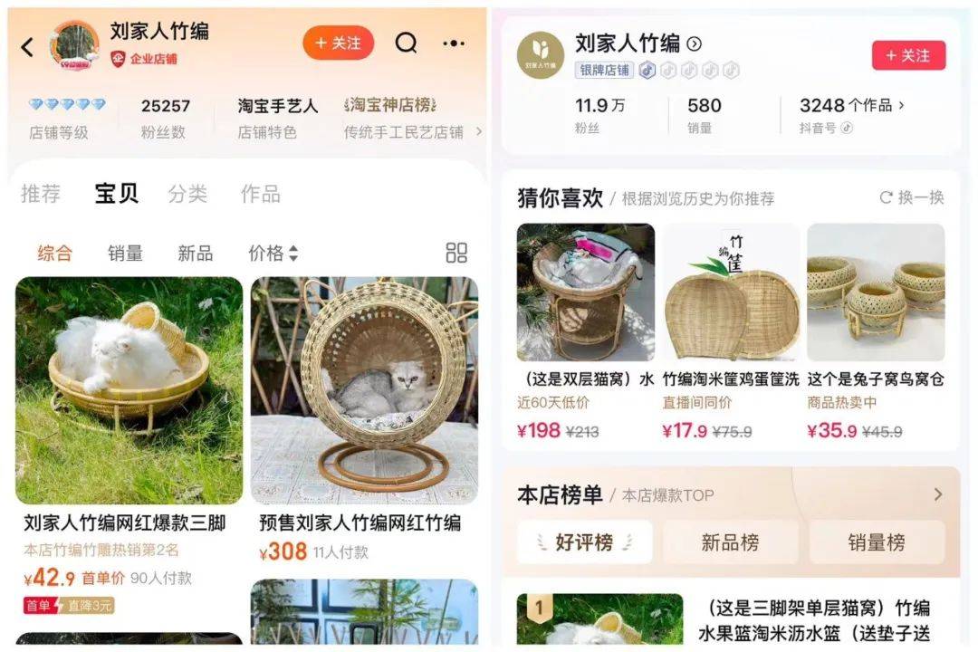根据卡思的观察,即使竹编猫窝的热度已经过去一段时间,@刘家人竹编 的抖音小店月销售额仍能达到上万元。此外,博主还开设了自己的淘宝账号,让自己的竹编制品在更多地方被人们看到。