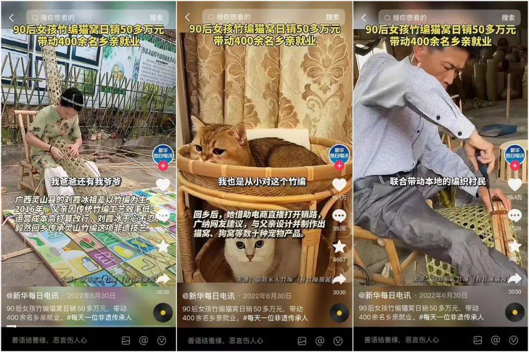也许是因为产品真的优秀,连绵不断的好评反馈让“竹编猫窝”的销量越来越高,成为一代网红产品。由于卖出太多,手工产品的制作周期也较长,博主还带领着村里的老蔑匠们加入制作,将竹编宠物制品发扬光大。