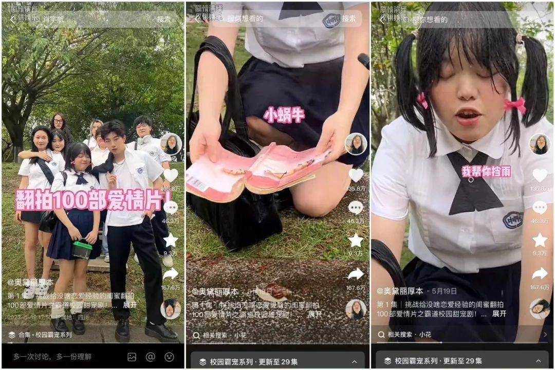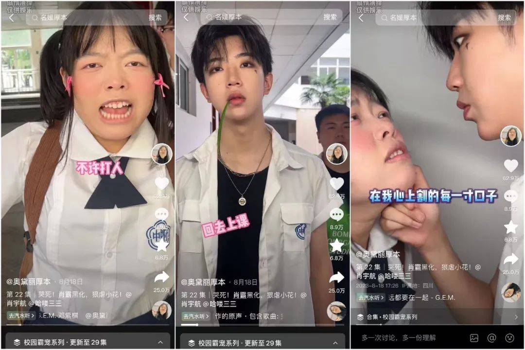 其一是校园题材的选择。《校园霸宠》其实是从“挑战给闺蜜拍100部爱情片”中诞生的子系列,过程中团队也尝试过拍摄民国虐恋、兄妹骨科、宫廷宫斗等题材的作品,但都没有《校园霸宠》火爆。