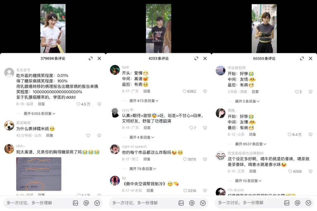 与厚本相反,@我叫星然啊 的采取了“离谱的剧情+真挚的演技”塑造反差感,粉丝们在看完全片后几乎都会留下神经、离谱、有病等评论,但在下次更新时又忍不住看完。