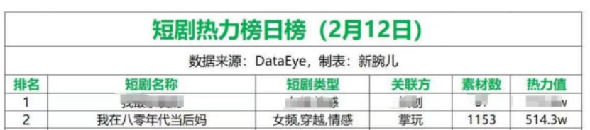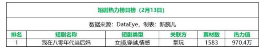 新腕儿联合DataEye数据显示,在2月12日,这部剧以514.3万的热力值排名第二。