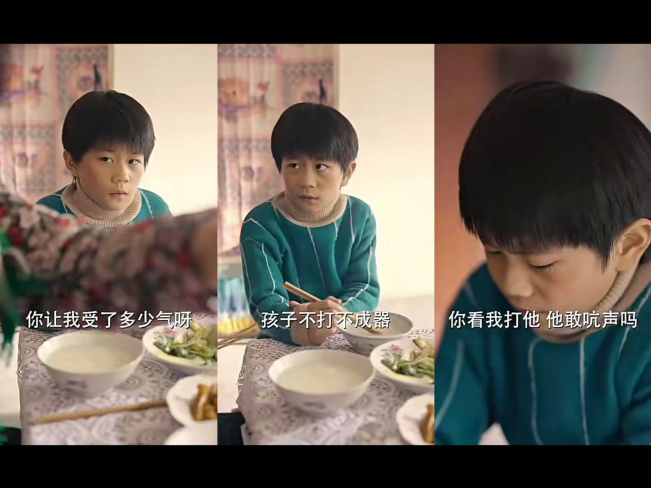 在同一个场景中,小演员的神情诠释了处境的艰难。