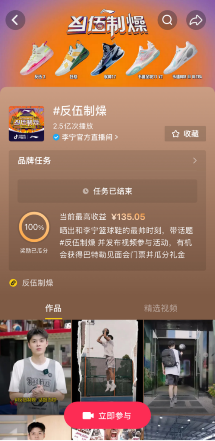 一方面,抖音电商开新日延续了发起挑战这个抖音原生内容推广的主流方式,并结合李宁反伍叁加壹怒沸撕系列赛事决赛热点,在平台发布了李宁全民任务挑战赛#反伍制燥,鼓励篮球爱好者通过参与短视频录制,关注和参与李宁叁加壹联赛“反伍怒沸撕星决战”及巴特勒中国行活动。
