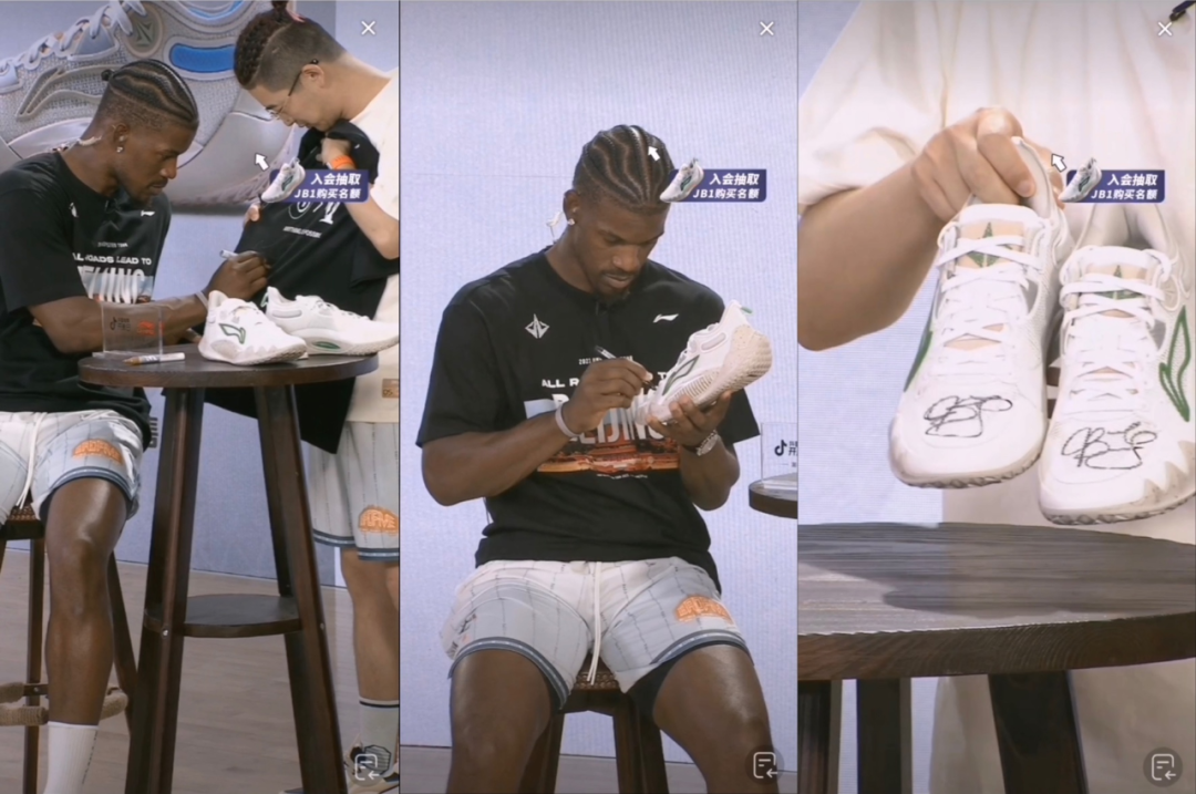 在此次合作中,抖音电商开新日以直击#巴特勒中国行 为热点话题进行内容传播与预热。话题不仅登上抖音热榜TOP27、抖音同城榜TOP1,更是辐射到站外虎扑热帖榜NO.8、微博体育榜TOP5,活动真正实现了全平台声量放大,为直播活动“NBA季后赛战神巴特勒空降品牌直播间”引流。并以巴特勒在直播间为粉丝送上亲手签名的JB1黑八限定配色尖货、抽购亲签球鞋、亲签T恤等为噱头,引爆直播间热度。