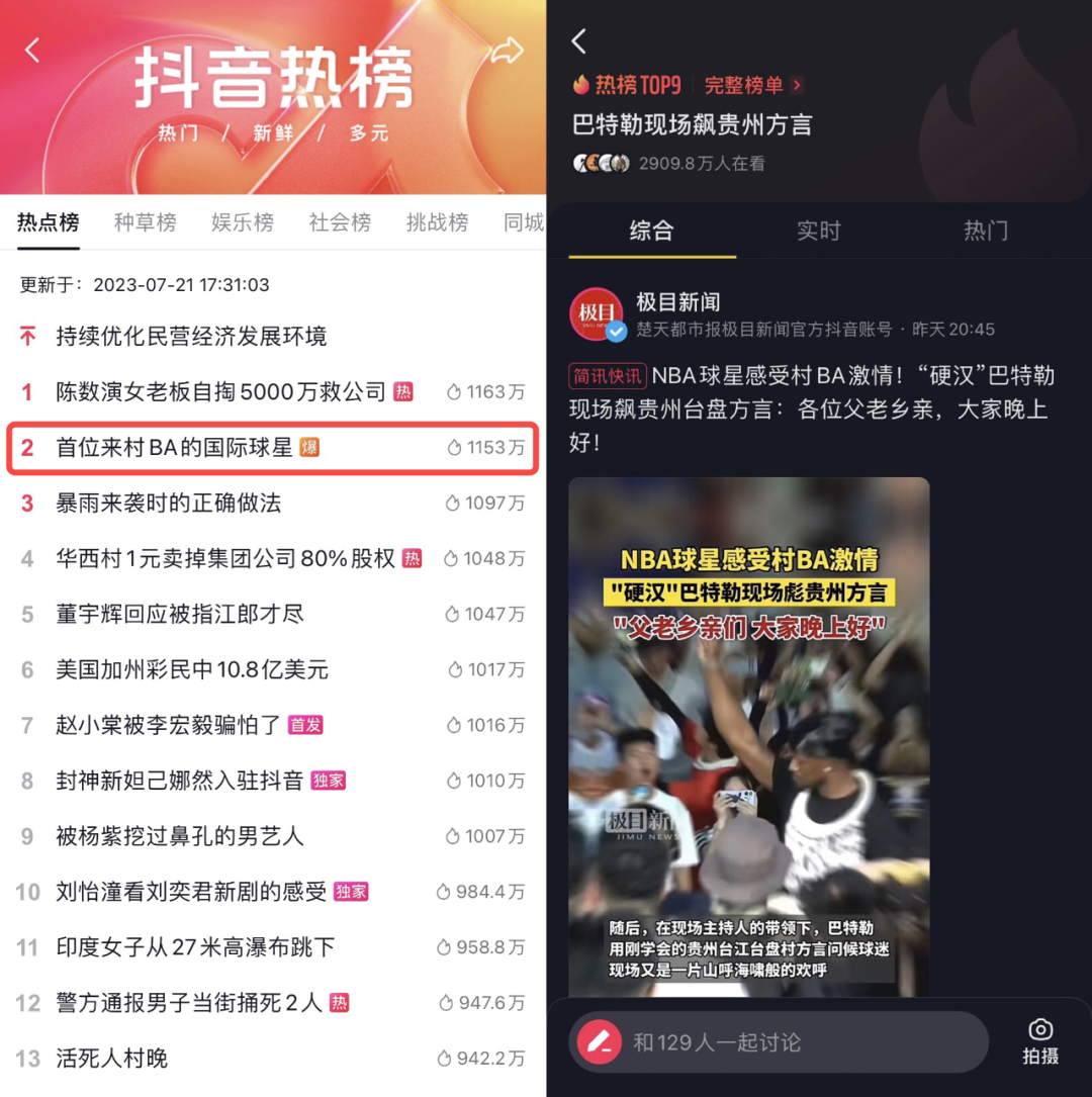 在巴特勒的中国行期间,几乎每一站行程都吸引了众多站内外用户的关注。其中,巴特勒也是以#首位来村BA的国际球星 话题登抖音热榜TOP2。而巴特勒中国行事件持续的热度,在开新日活动期间不断引流用户进入李宁篮球旗舰店和直播间,为销售延续火力。