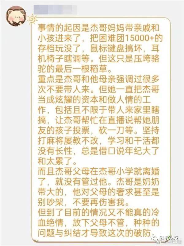 重点是杰哥和他母亲强调过很多次不要带人来,但她一直把杰哥当成炫耀的资本和做人情的工作,包括且不限于带人来家里瞎搞,让杰哥帮忙在直播说帮她朋友的孩子投票,砍一刀等,坚持打麻将屡教不改,学习和干活都没有长性,总是借说年纪大了和太累了。