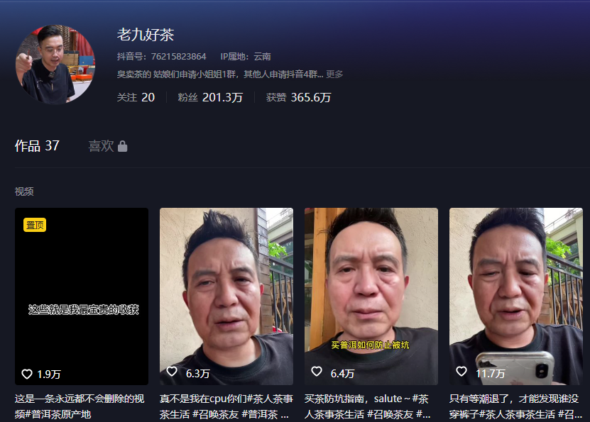 在这种“行业内幕”和声情并茂的渲染下,“老九好茶”的突破了茶叶主播的限制,成为了网友眼中的段子主播,并在一周之内涨粉100多万,目前他在抖音共有201.2万粉丝。