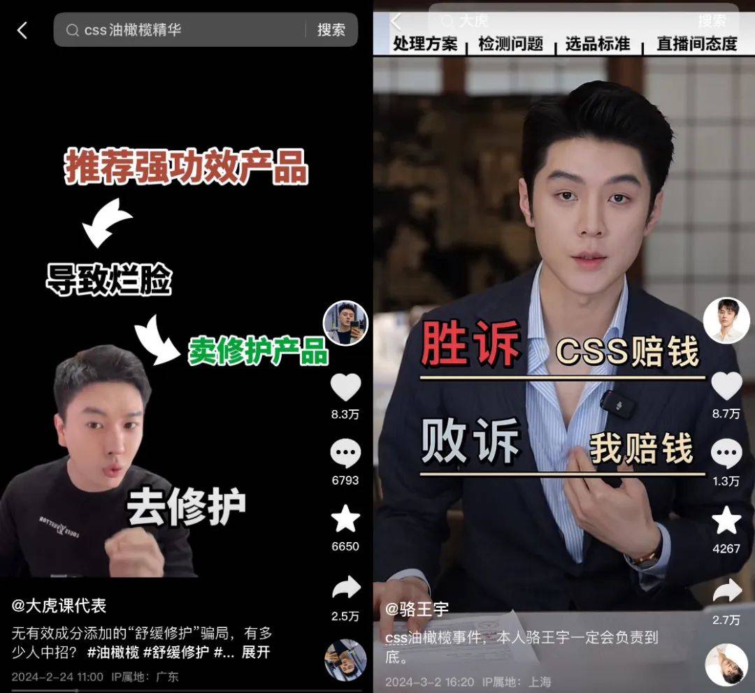 之后,曾带货CSS的头部美妆博主@骆王宇 两次回应该事件。3月2日,骆王宇表示不仅给CSS发了律师函,还向市监举报CSS涉嫌虚假广告宣传。骆王宇还承诺,若他自己胜诉,品牌赔偿消费者损失,败诉,则由自己赔偿。