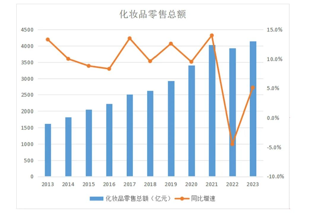 一开始,美妆内容赛道的繁荣是源于用户需求推动了消费、也推动了内容的增长,如今美妆赛道凋零,则是基于需求的减退。国家统计局的数据显示,2023年全年,限额以上化妆品类总零售额虽然再创新高,达到了达到4142亿元,但增幅为5.1%,仅高于2022年的-4.5%,并未回到疫情前水平。