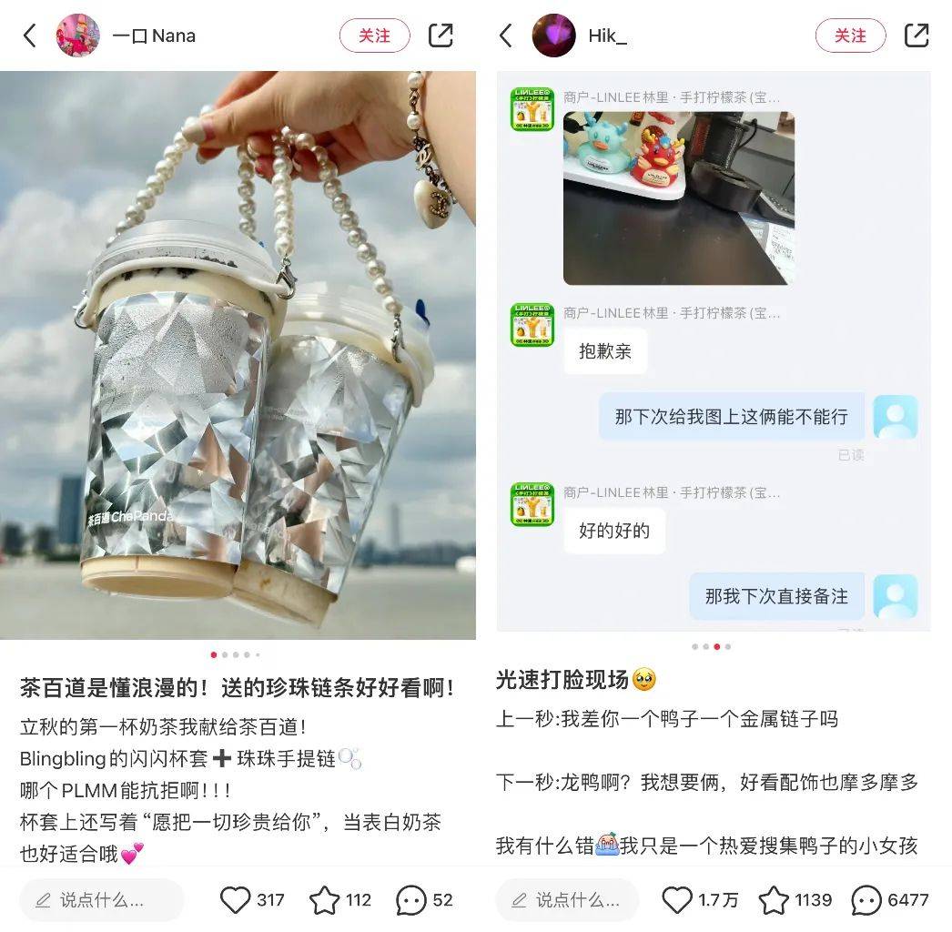 去年8月,奶茶品牌茶百道推出限定闪闪杯,bling bling的杯套搭配大珍珠链条,让其在2023年立秋火了一把。其中珍珠手提,既可以当提手,又可以拆卸下来DIY成衣饰、手链、挂件,这种实用的设计激起了用户主动分享的欲望,为品牌制造了免费流量;LINLEE林里·手打柠檬茶 则靠着买奶茶送鸭子玩具的活动吸引了众多年轻粉丝,从而为品牌塑造了差异化定位。