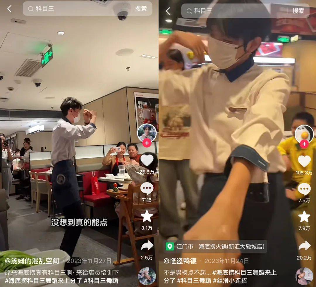 伴随着“科目三”的爆火,海底捞趁势入局,在线下门店展开了热闹的男色营销。只要有客户提出想看科目三,店内的帅哥员工便会英勇上阵,表演一套丝滑小连招。与之相关的各式视频在短视频上广泛传播,收获了诸多点赞。