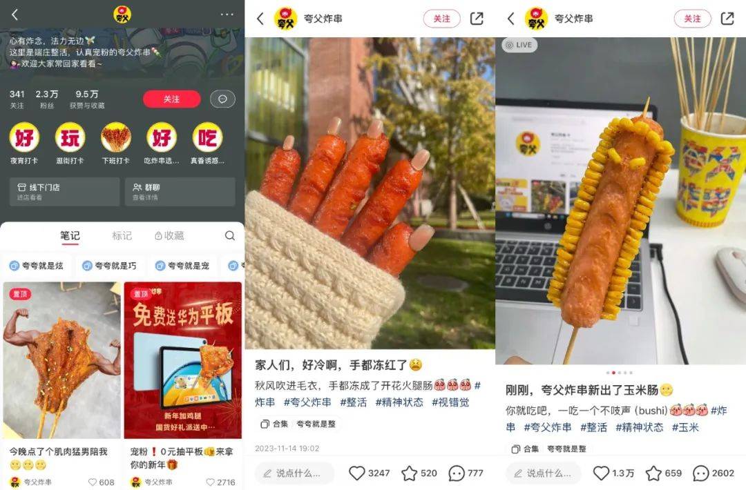 发疯文学,原本是年轻人的一种夸张式情绪表达,而后逐渐演化成了品牌在新流量平台的营销路径,不可否认的是,用户们对这类互动积极、反馈迅速的营销方式接受良好。在夸父炸串的主页中,我们可以看到运营人员拼尽全力博得用户一笑的精神状态,比如在一条笔记中,将玉米粒一颗颗粘在火腿肠上,做成一个怒发冲冠的抽象玉米棒,引来众多网友围观。该条笔记获得了1.3万点赞、2600条评论。