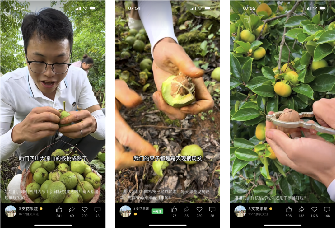 还有3支花果蔬,原本三个男生都拥有了稳定的工作,但因平稳生活没能圈住这些“自由的灵魂”,便选择了递交辞呈,一头扎进了大凉山深处,开启另类创业,做出单条阅读量破 4400 万的视频,并将糖心苹果、山核桃等土特产,累计销售出了 7 万多单。
