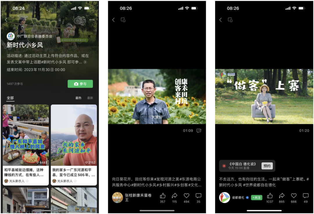 视频号作为后起之秀,今年视频号也在持续助力“在县经济”,与中广联合会县域融媒委员会联合发起新时代小乡风 视频号活动。创作者只要在短视频文案中带上相关话题标签,发布三农相关视频,优质作品也将得到官方的推荐和流量扶持。
