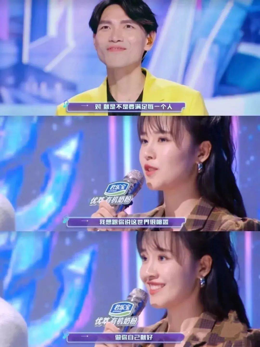 “我刚刚在这个舞台上看到了作为一个歌手最大的真诚。我们终其一生不是为了要满足每一个人,你已经找到了跟自己同频共振的那一部分人。作为其中的一员,我想跟你说,这世界很喧嚣,做你自己就好。“