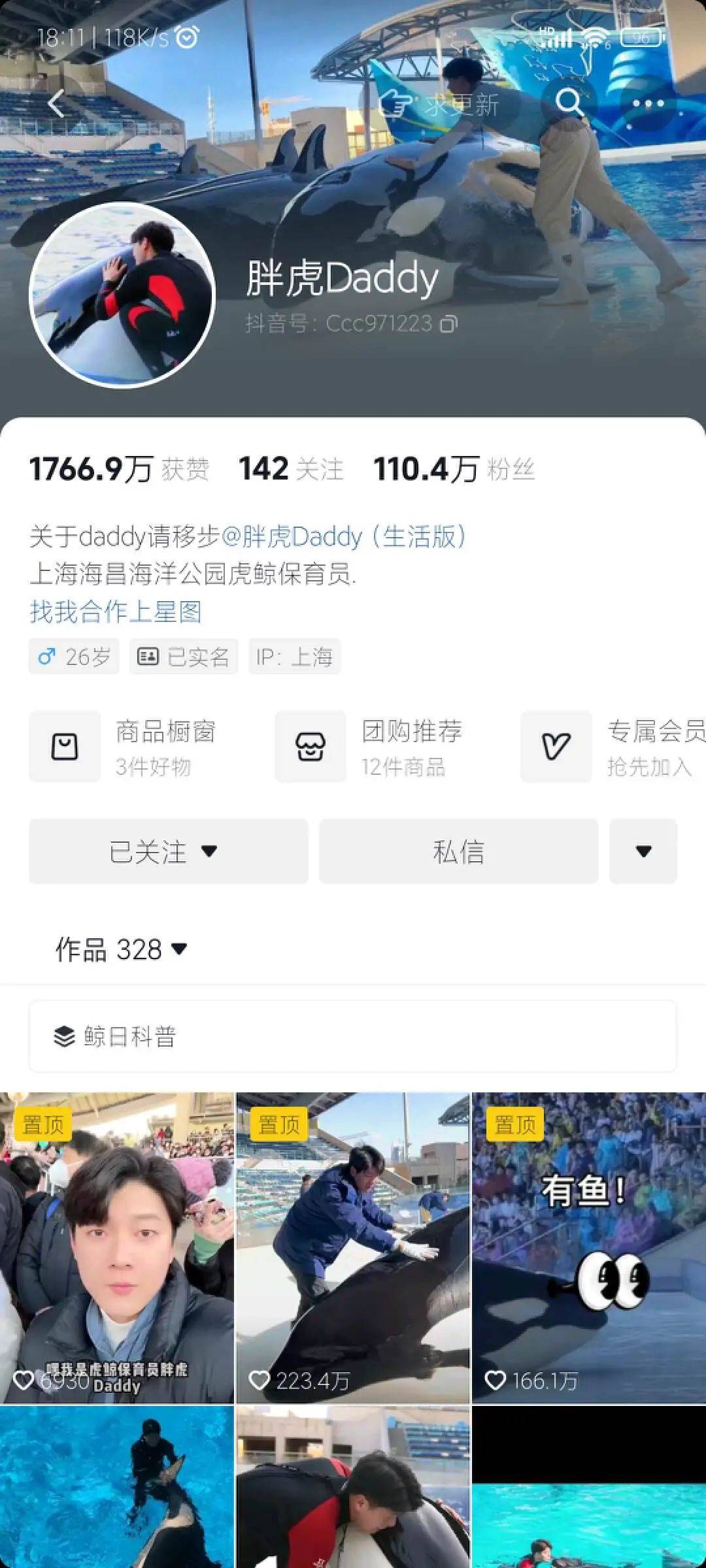 在抖音账号 @胖虎Daddy ,粉丝们可以看到“奶爸”给胖虎搓澡、喂鱼,也可以欣赏虎鲸“胖虎”游泳、跳跃、炸水。