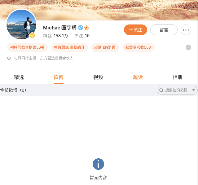 2月底,在与辉同行直播间中,因为表示“不会讲解”一款女式内衣,董宇辉被推上热搜,包括“董宇辉说不讲内衣就是害羞”“董宇辉三拒讲解内衣内裤”话题居高不下,董宇辉无奈地表示,反感热搜,要把微博注销。27日,认证为“与辉同行主播,东方甄选高级合伙人”的董宇辉个人账号显示,内容已清空。