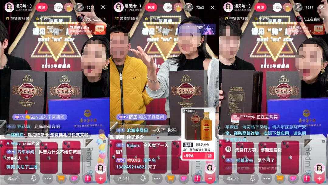 可惜的是,“遇见她”的直播带货并没有什么特色,而是参照很多明星直播的模板,以不打烊的形式来拉高直播时长,以抢茅台的活动来提高粉丝停留。