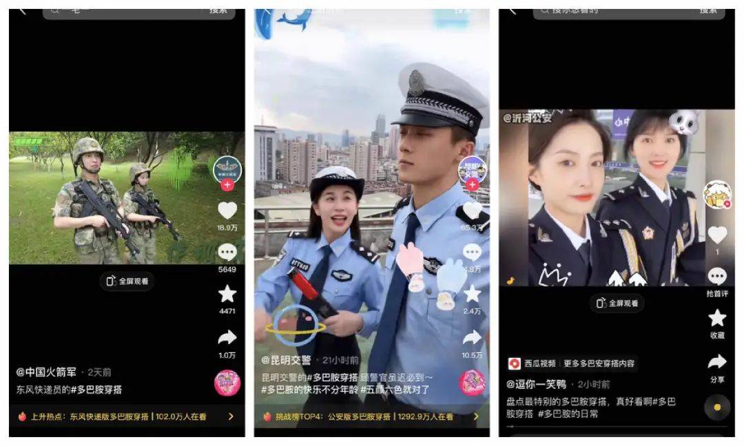 如果说网红明星的加入还是停留在娱乐,那么接下来,交警、武警、解放军的加入,则真正意义上促进了「多巴胺穿搭」扩散到全民层面。