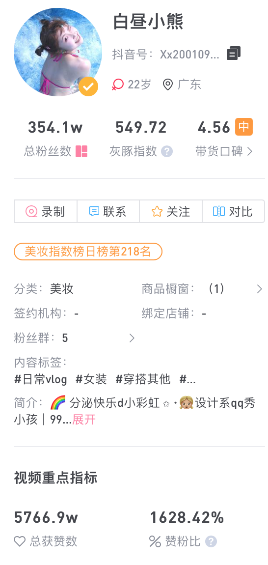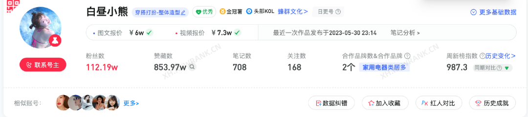 数据数据平台显示,@白昼小熊小红书的图文报价单价 6 万/条,视频报价 7.3 万/条,可以说这个 00后的女孩的收入,刚出校园就超过了绝大部分同龄人。