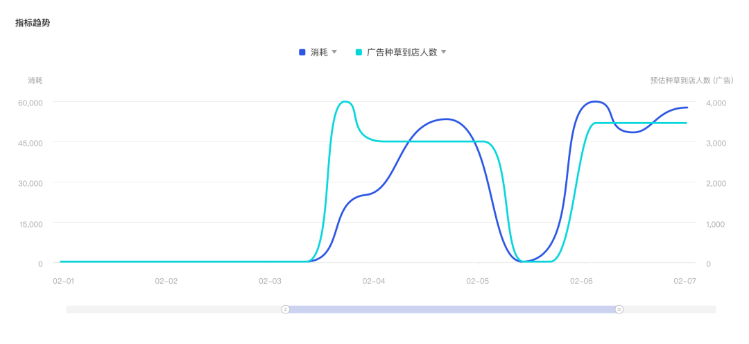 商家还可以自选2个指标,比如广告投放的消耗额与广告带动的门店种草客流,来对比它们在一段周期内的趋势变化。