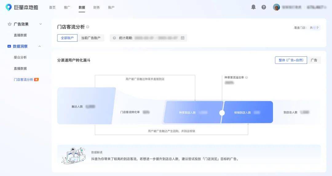 针对本地商家难以统计抖音营销全域价值的痛点,抖音生活服务的一站式营销平台——巨量本地推近期全端上线“门店客流分析报表”产品,清晰展示商家“客流转化率”“种草到店人数”等数据统计,帮助商家更加全面地了解门店客流从何而来。