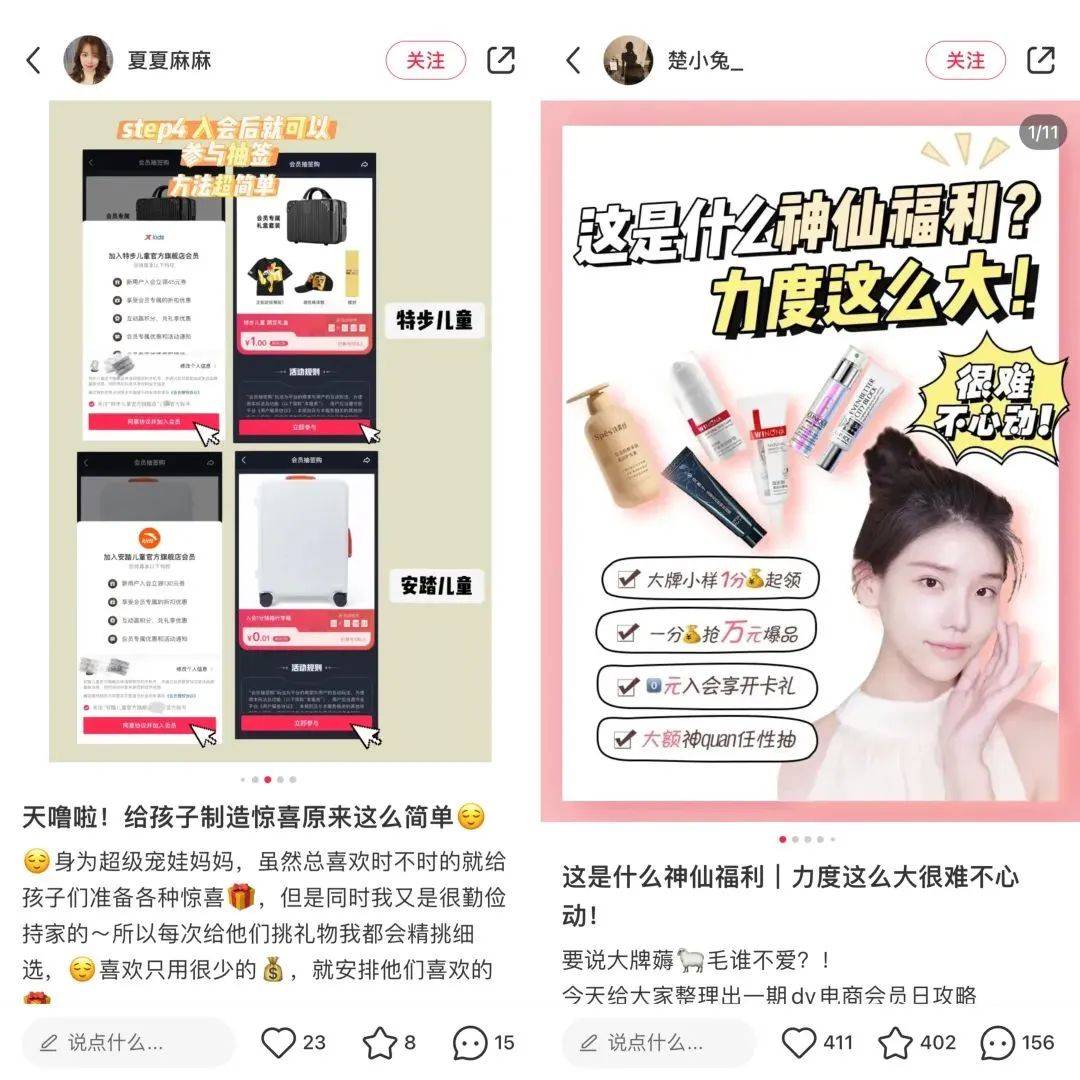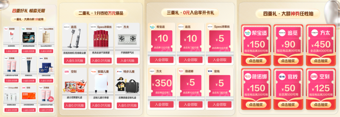这种策略方便了入会操作,因为原先的常规方式需要用户先完成消费,门槛高而不易实现。但是此次活动中,“大牌小样一分钱起领”和“一分钱抢万元爆品”两种权益则明显增加了拉新入会的效率,所以这种以小博大的游戏对用户有着极强的吸引力。入会几乎没有任何门槛,而派发样品和爆款则是“以产品为核心”的策略,使得用户直接涉足产品使用环节。试用感受良好后,随后的复购几率也会提高。