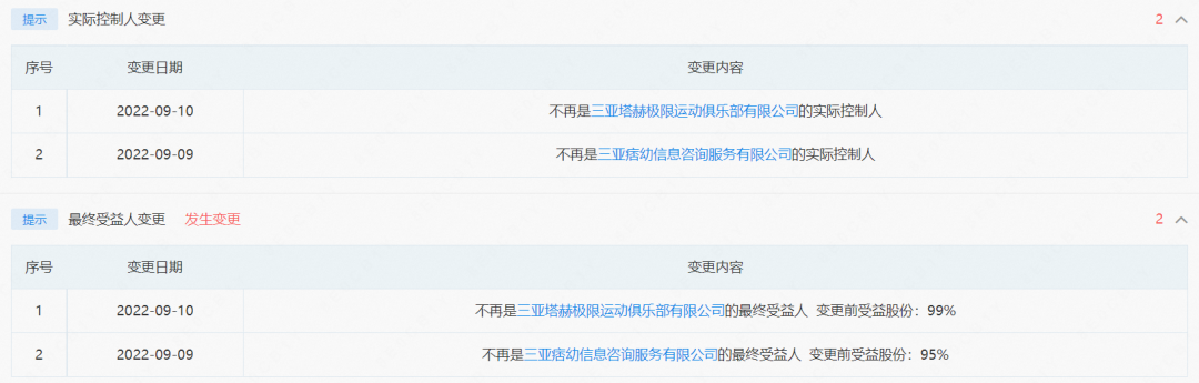 陆文臣本人也和这家挂有痞幼名字的公司有着不小的联系。2022年9月8日,陆文臣退出三亚痞幼信息咨询服务有限公司,不再是大股东,他名下的北京塔赫极限运动俱乐部有限公司也在2022年9月28日发生了股权变动,持股比例从95%下降到50%,另一位新增持股50%的股东陈文来,曾担任三亚痞幼信息咨询服务有限公司的总经理。
