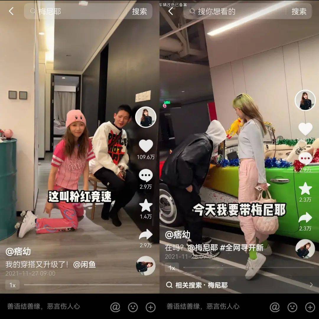 因为变装和剧情出圈的梅尼耶主打颜值和生活赛道,和痞幼合作后一起拍摄了探店、变装和搞笑等内容,让痞幼的视频内容出现了更多生活化的场景,也为痞幼吸引了一批新的粉丝。在合作最频繁的2021年10月—2022年2月,痞幼的账号涨粉超过640万,她也借此快速完成了垂类网红到全域网红的转型,视频中也出现了智能家居、美妆个护和App宣传等广告。