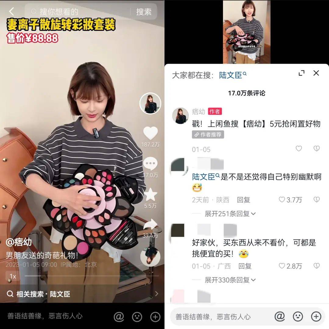 另一方面,这可能也是痞幼为自己巩固人设和打造新内容做铺垫,官宣男友的极限运动俱乐部与痞幼之前打造的运动少女人设契合,勇敢追爱的表白也让痞幼打造的“敢想敢做”人设更加丰满。近期痞幼的多条视频都提及到陆先生,一条闲鱼广告短视频主题变成了收到老陆的奇葩礼物,最后表示自己已经把这些放在闲鱼上转卖了,点赞数量也达到了188万。
