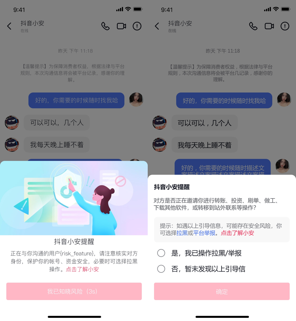 “过去,我们最重视的是如何去打压诈骗分子,困住他们”。抖音小安的出现,则让我们重视起与用户的交互,从提示、教育上避免诈骗行为发生。