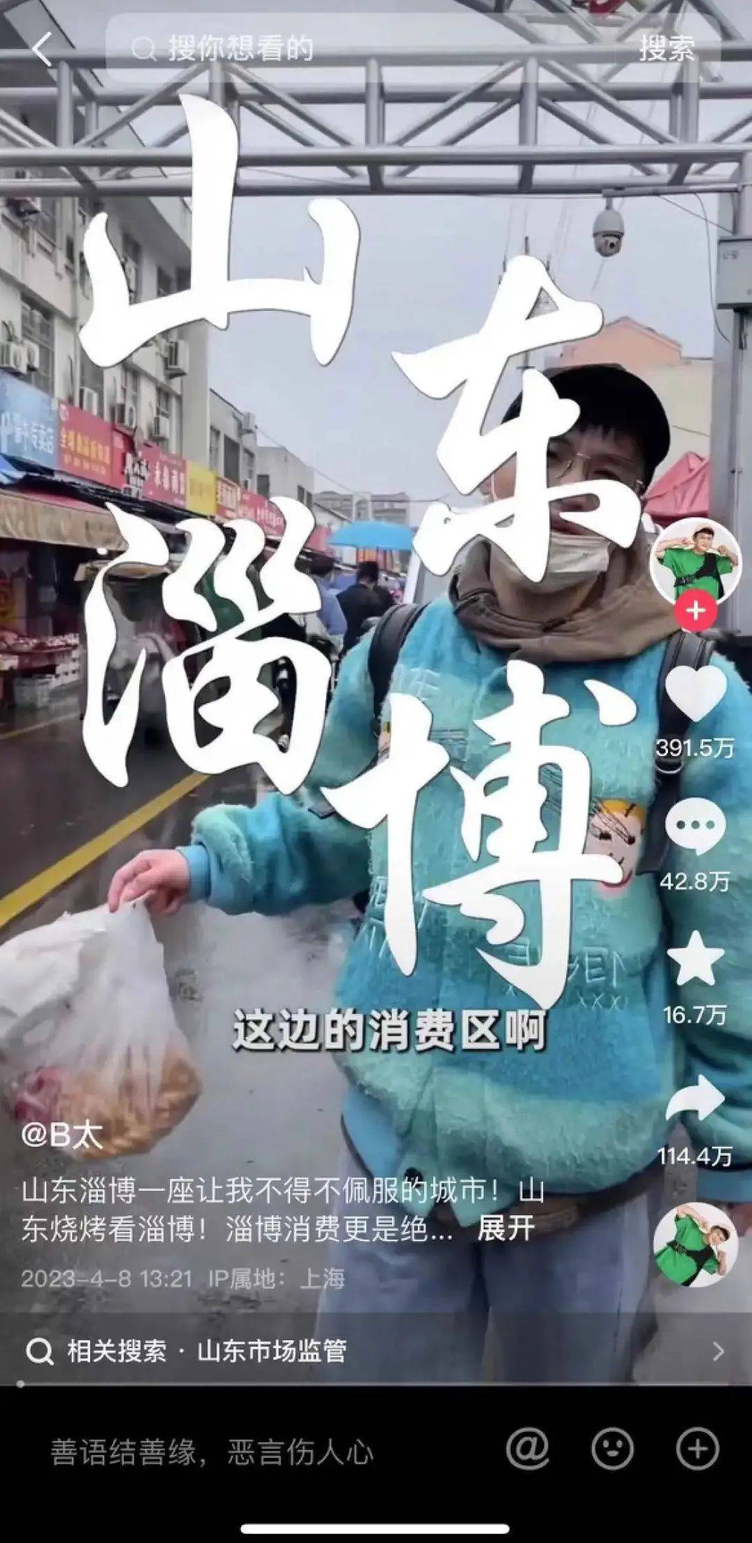 淄博探测短视频迅速爆红,取得了 391 W 赞,粉丝们疯狂转发,淄博烧烤迅速火遍全网,这条视频可以说是早期最火的的“淄博烧烤”短视频,B太也可以算是,带火淄博烧烤的第一个网红。