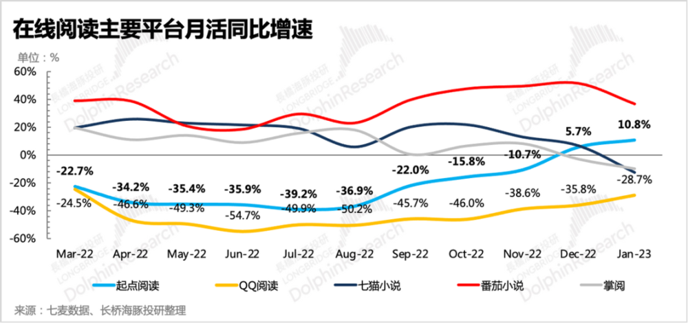 从最近的在线阅读主要平台月活同比增速来看,字节的番茄势头依旧十分凶猛。