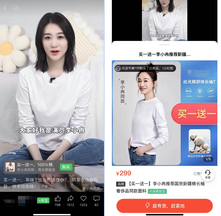 视频内容主要是以明星坐镇推荐,以原生口播进行拍摄,节奏正常。展现形式简单,以明星讲述产品卖点,突出产品功能性。明星效应会使得消费者更加信任,且最后几秒还抛出“是不是真的好穿,只有穿过的人有发言权”,引导用户去购买。