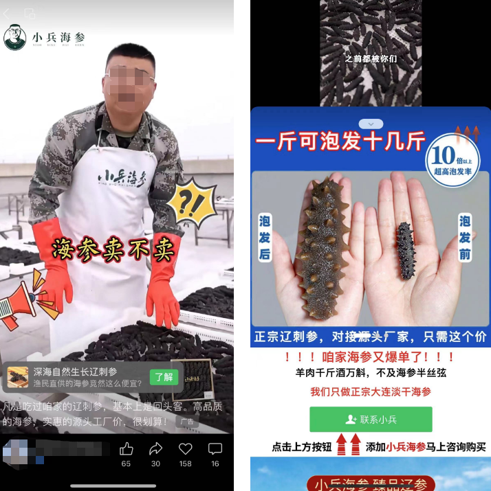 视频内容是以素人进行口播,其中穿插产品的各个特写镜头,展示产品的特点。且视频还表达该号主产品为渔民直供,价格会比其他地方都要便宜,突出价格低廉,产品又优质,故容易吸引用户点击,视频的最后表明包邮,再直接引导购买。
