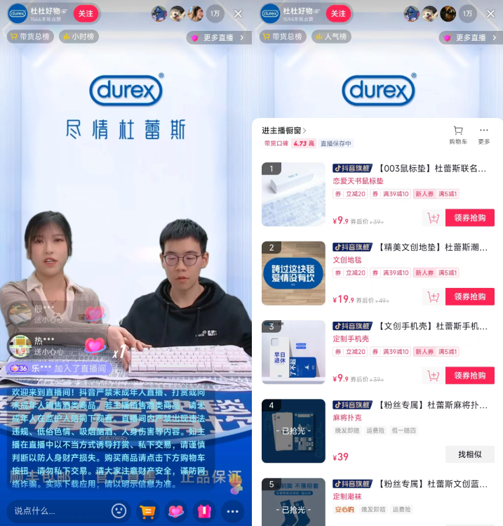 但是大家不要急,杜蕾斯来了!杜蕾斯不仅在抖音开启了直播,还亲自下场带货了!