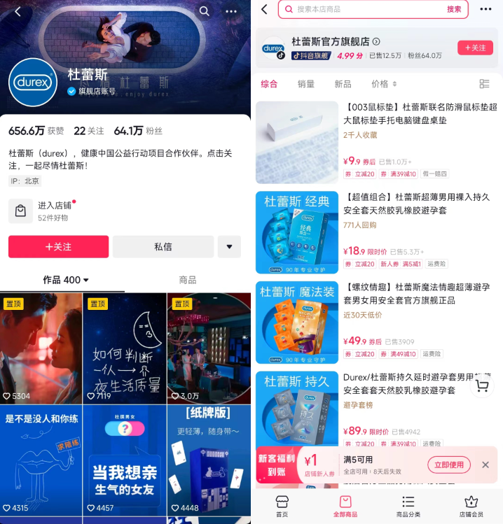 据查询,除了“杜杜好物”以外,在抖音还有两个杜蕾斯官方认证的账号,分别是“杜蕾斯”和“杜蕾斯旗舰店”,其中“杜蕾斯”粉丝超过64.1万,内容以创意广告为主;“杜蕾斯旗舰店”粉丝有8204,内容为两性动漫。