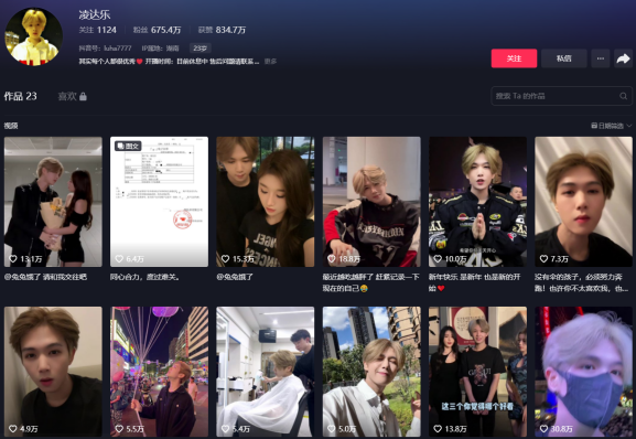 还有一位抖音带货榜上出现一位新的“常客”,即主播凌达乐,如果对这个名字略显陌生,那么他的曾用艺名“鹿哈”,应该比较熟悉。曾经组了个山寨“ESO”组合,团队内还有“王二博”、“易烊干洗”,“黄子诚”等成员,模仿对象涵盖了来自EXO,TFBOYS等不同组合的艺人。根据灰豚数据显示,其30天内的直播销售额可高达3000万,新增粉丝曾达137万。成绩最好的时候,凌达乐登上过抖音当日总榜第二,比一些真正的明星还高。目前,“凌达乐”的抖音粉丝高达675.4万。对于他的成绩,有网友疑惑,“山寨明星”的直播模式,难道又可以跑通了?