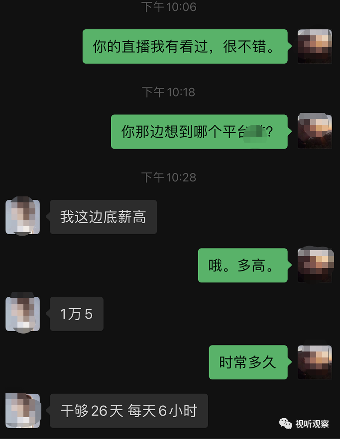 也有运营挖主播的时候,主播这样说的:我这边底薪很高,保底1万5,每个月26天,每天6个小时。运营问道,目前收入多少?