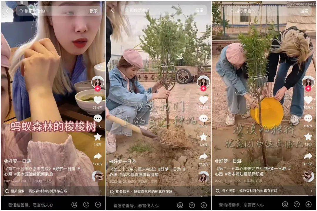 比如在和小姐姐去内蒙古寻找蚂蚁森林的梭梭树时,即使有着明确的定位地点,但因为风沙和路况,车子完全无法前进。最后,游子和小姐姐一起在内蒙古的沙漠里“为地球种下两颗新树”,虽然许愿人和屏幕前的粉丝都没有见到愿望中的那棵树,但“一趟飞机+6小时的车程”的奔波,让地球多了一抹绿色,所有人都觉得“这很酷”。