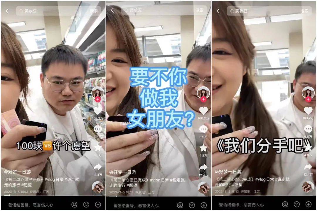 可以看到,以上两位创作者作品的一大特点,就是与粉丝或者是陌生人的“随机共创”。而现在,随着这一卖点的走红与出圈,创作者们由此为基准,延伸出的点子越来越多,这种在陌生人里“捞人”拍视频的内容形式也愈加丰富。
