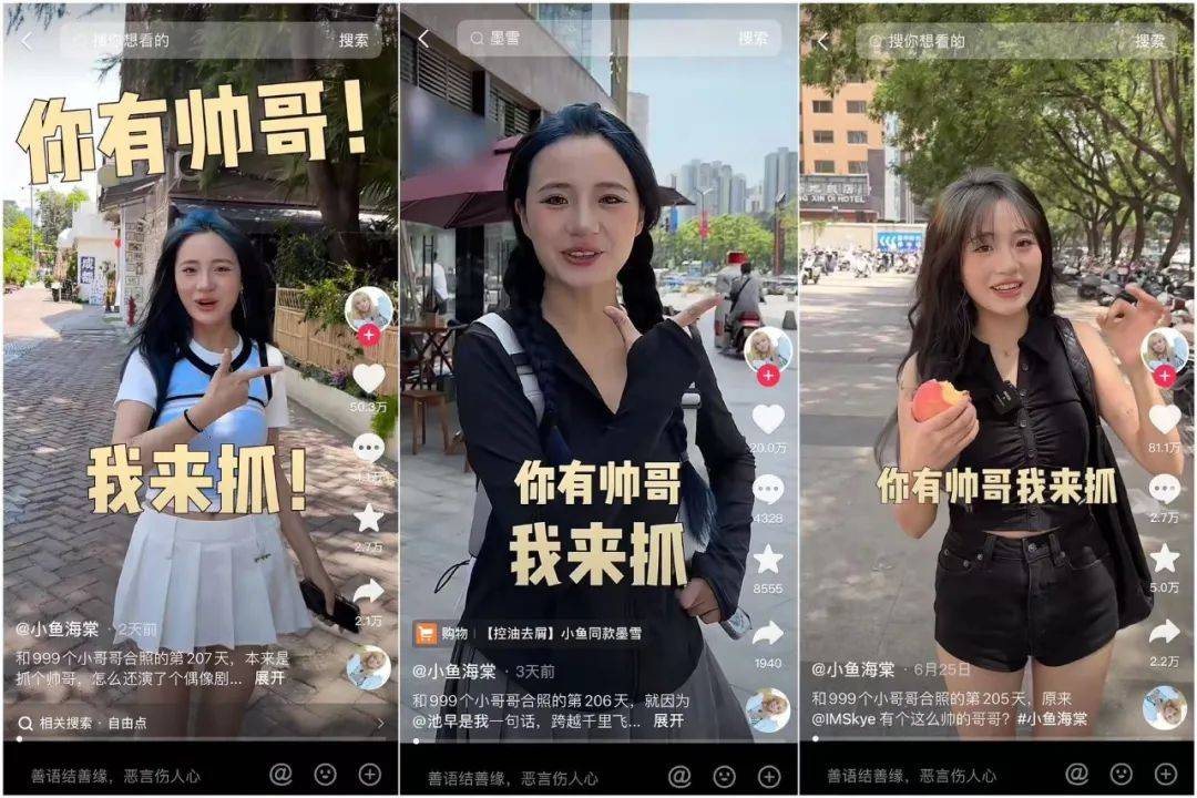从大街上随机“挑选”幸运观众,一起拍摄短视频的创意或许可以追溯到@小鱼海棠——一个“励志和999个很帅的男生拍照”的美妆/摄影博主。