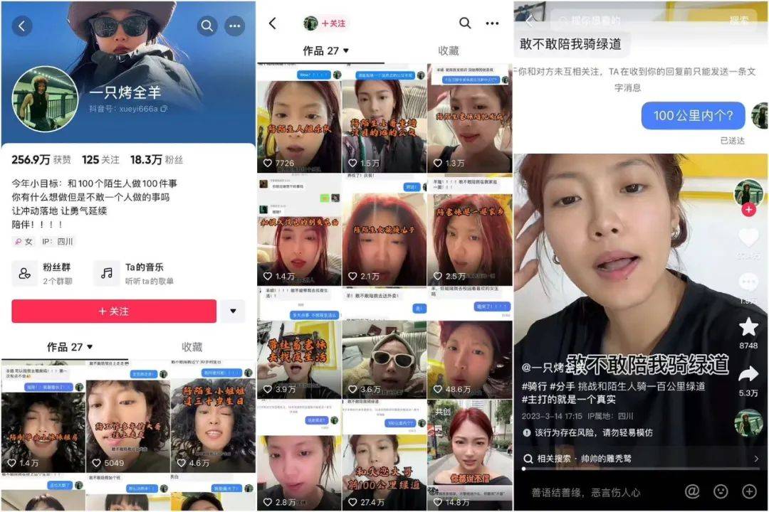 和@好梦一日游 类似,她的视频除了完成大家提出的挑战外,总是会和这位陌生人聊聊他的生活和苦恼,从他们的对话中,观众能够体会到原来每个人都面临着烦恼与焦虑,原来有那么多人能够和自己感同身受。