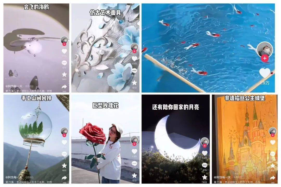 手工博主@阿饶每一天 更是很好地利用了自己的优势,用自己亲手做的小礼物比如永不凋谢的“玻璃花”、仿古艺术面具、会唱歌的音乐墙、一把水扇、巨型玫瑰花、非遗绒花发簪、留住记忆的气味相册、非遗掐丝公主城堡……和100个陌生人做礼物交换。