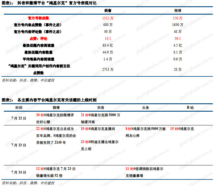 从官方账号表现来看,抖音涨粉量更多,微博点赞数更高。截至 26 日,抖音平台鸿星尔克官方旗舰店账号共有 1312 万粉丝、(事件发生后至今)短视频内容获得 480 万点赞;官方微博共有粉丝 150 万,(事件发生后至今) 获得 1630万点赞; B 站账号共获得 13 万粉丝、 50 万点赞。