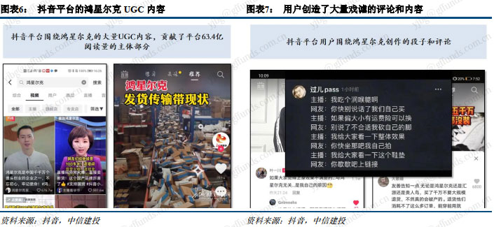 更多普通用户上传短视频内容: 抖音“#鸿星尔克”话题共有 44.9 万条视频,而事件之后,鸿星尔克的三个抖音官方账号共计上传视频仅为 74 条。由此可见, 抖音已形成丰富的创作者生态,用户更愿意自发在抖音平台上上传短视频内容。 根据《2020 抖音创作者生态报告》中,抖音 2020 年新增 1.3 亿创作者。