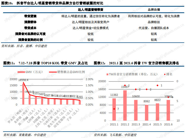 但是以 Teenie Wennie、太平鸟为代表的一批抖音平台商家,实现了稳定持续的自播。 2021 上半年, TeenieWennie 每个月均位居抖音店销售额前 10 名,按照其最高月 GMV1.55 亿来算, 其尚未达到头部罗永浩单周带货的能力。 但是对品牌而言,自播相对而言成本更低,不再依赖明星达人,并能够为自有的抖音小店沉淀更多粉丝。