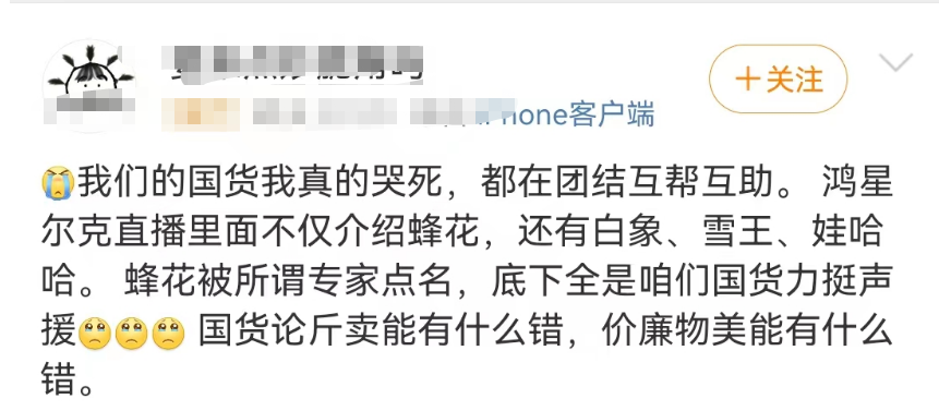 所以各位国货应该学蜂花,盯紧各位主播和明星,只要他们塌房你们就去捡粉,维护整个生态的稳定性。